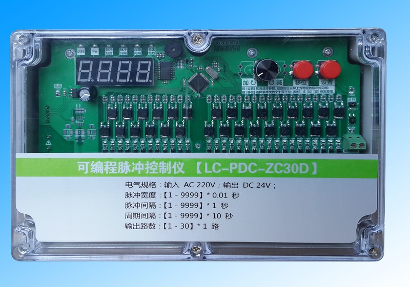 脈沖袋式除塵器控制儀 LC-PDC-ZC30D (在線式 30路 24V),此款控制儀電壓有24V和220V兩款,購買時請告知客服選用電壓,以免為您造成不必要的損失。此款脈沖控制儀輸出路數(shù)可調(diào),凡是所控脈沖閥數(shù)量為30個以下,全部可以使用。