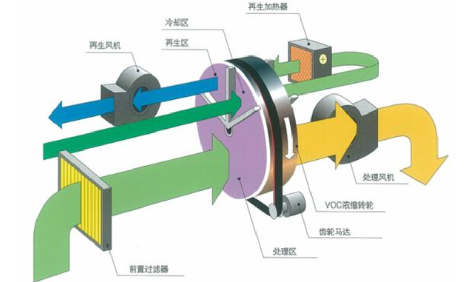 通過轉(zhuǎn)輪的旋轉(zhuǎn),可在轉(zhuǎn)輪上同時(shí)完成氣體的濃縮和沸石的再生。進(jìn)入濃縮轉(zhuǎn)輪的有機(jī)廢氣在常溫下被轉(zhuǎn)輪吸附區(qū)吸附凈化后直接排放至大氣,接著因轉(zhuǎn)輪的轉(zhuǎn)動(dòng)而進(jìn)入脫附區(qū),吸附了有機(jī)物質(zhì)的沸石在此區(qū)內(nèi)脫附,吸附在沸石上的有機(jī)物被分離、脫附、進(jìn)入后續(xù)處理系統(tǒng),如此循環(huán)工作。