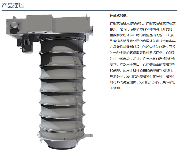 散裝物料伸縮溜筒主要特點:1.伸縮溜筒配套除塵器系統(tǒng),通過抽氣來收集裝料時產生的灰塵。2.自動控制卸料口接近卡車和火車車皮,從而節(jié)省時間,卸料口根據(jù)物料會迅速調整。3.外套筒用于控