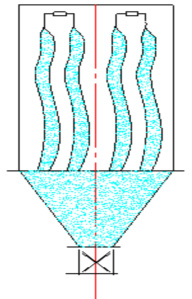 含塵氣體由進氣口進入灰斗或儲灰箱,通過花板孔或直接通過花板孔三種方式進入濾袋。如圖2a、b、c所示,含塵氣體透過濾袋變?yōu)閮魵猓M入箱體,再經(jīng)箱體上部排氣口,由風機排走。粉塵積附在濾袋的內(nèi)表面,且不斷增加,使袋收塵器的阻力不斷上升。當阻力上升到1500—2000Pa時為了使袋收塵器繼續(xù)工作,需定期清除濾袋上的粉塵。具體清灰時,首先關(guān)閉頂上風機,搖動電機上偏心作用,帶動連桿,使搖動軸左右來回轉(zhuǎn)動,濾袋就呈波紋狀態(tài),使粉塵掉下,卸出。清灰狀態(tài)如圖3所示。