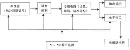 本控制儀由雙時(shí)基電路CH7556的1/2作為無穩(wěn)態(tài)多諧振蕩器產(chǎn)生周期為1~99秒的可調(diào)脈沖信號;另1/2作為單穩(wěn)態(tài)電路完成計(jì)數(shù)、譯碼、脈沖分配等一系列邏輯功能,再由專用電路的各輸出端輸出所設(shè)定的脈沖寬度信號至電子開關(guān)(VMOS電路),控制電磁脈沖閥的開啟,噴吹壓縮空氣,同時(shí)由數(shù)碼管顯示噴吹順序。