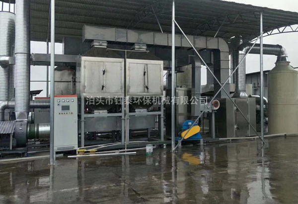 設(shè)備原理:在催化劑的作用下,有機(jī)廢氣在較低的起燃溫度下(250~400℃),發(fā)生無焰燃燒,碳?xì)浠衔锉谎趸纸鉃镃O2和H2O,同時(shí)放出大量熱能。 設(shè)備優(yōu)勢(shì):安全性好、凈化效率高、操作費(fèi)用低 設(shè)備應(yīng)用:中高濃度(500mg/m3-5000 mg/m3)的有機(jī)廢氣凈化,低濃
