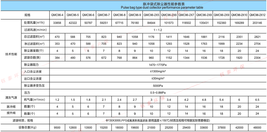 除塵清灰工作過(guò)程為:以一個(gè)袋為例,含塵氣體由進(jìn)口處直接進(jìn)入氣箱的袋室;由于有負(fù)壓風(fēng)機(jī)的引力驅(qū)動(dòng)作用,含塵氣體由外及里,自下而上,克服阻力,穿越濾袋到達(dá)上部箱體;粉塵就會(huì)被阻擋在濾器組件之外,小的顆粒被吸附在濾芯的表面,大的顆粒直接掉到下面的灰斗中;經(jīng)過(guò)過(guò)濾后的含有微塵的氣體在脈沖提升閥處匯集,之后從出風(fēng)口排出,此時(shí)便是干凈的氣體。過(guò)濾狀態(tài)就是對(duì)含塵氣體進(jìn)行除塵。當(dāng)過(guò)濾工作達(dá)到一定時(shí)間(或阻力達(dá)到預(yù)先設(shè)定值),清灰過(guò)程開(kāi)始。其工作過(guò)程為:控制器發(fā)出信號(hào),使脈沖提升閥關(guān)閉,阻斷排氣;壓縮空氣脈沖閥開(kāi)啟,以大于0.5MPa的壓縮空氣經(jīng)脈沖閥噴入凈氣室;并迅速膨脹入濾袋內(nèi),并產(chǎn)生振動(dòng)作用,清除濾袋外側(cè)表面上的粉塵,粉塵掉落到灰斗。這個(gè)動(dòng)作完成后(大約6~15s),壓縮空氣脈沖閥關(guān)閉,提升閥重新打開(kāi),該箱室的濾袋重新回到過(guò)濾狀態(tài)。