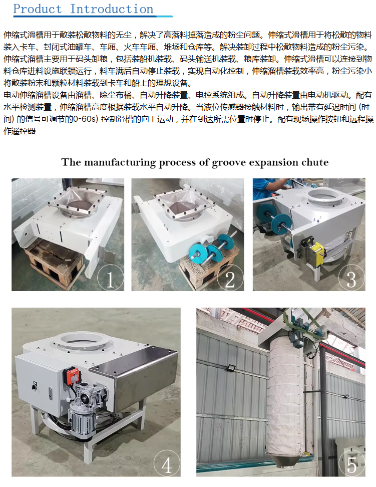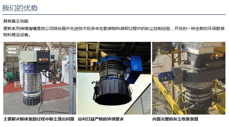 服務(wù)電話:13091153069(同微信)伸縮式卸料管是一種物料處理設(shè)備,用于將粉末和干散狀物料無塵地裝入或卸入容器、卡車和船只。它是一種自動化且靈活的解決方案,可以根據(jù)不同行業(yè)的需求進(jìn)行定制。伸縮式卸料管系統(tǒng)的主要功能是通過垂直的鐵管利用物料自身的重量排放粉末或顆粒狀散裝固體,同時(shí)通過外層的一層帆布材料的布筒收集卸料時(shí)產(chǎn)生的粉塵。為了適應(yīng)上部排放點(diǎn)和下部裝載點(diǎn)之間的不同高度,鐵管被設(shè)計(jì)為可伸縮的。鐵管的靈活性是伸縮式卸料管系統(tǒng)的關(guān)鍵特性,它允許根據(jù)不同的排放和裝載點(diǎn)進(jìn)行調(diào)整,使其成為廣泛應(yīng)用的多功能解決方案。